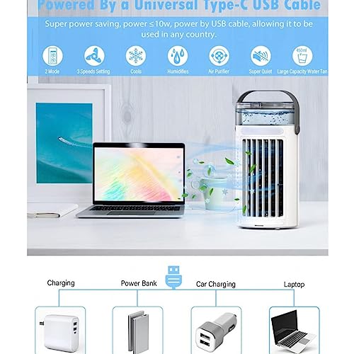 Mini-verdampingsluchtkoeler, sproeiluchtbevochtiger, bureauventilator en luchtreiniger in één. Gebaseerd op de natuurlijke waterverdampingstechnologie. Met de nieuwste verdampingskoelingstechnologie die je uit de buurt van droge lucht houdt en van de mistige lucht kan genieten.